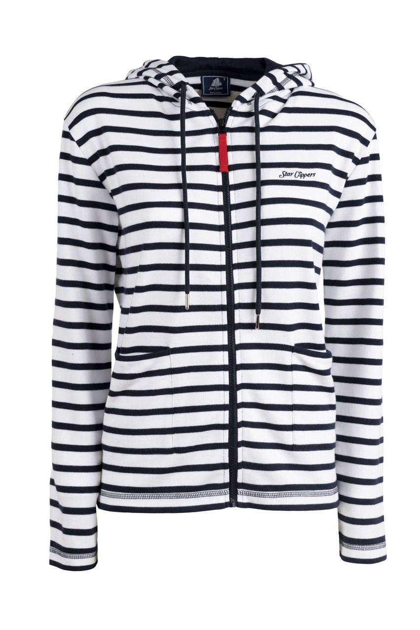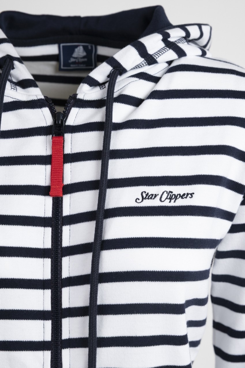 Veste jogging en avec capuche100% coton elasthane avec rayures marines. Tailles du S au 3XL.