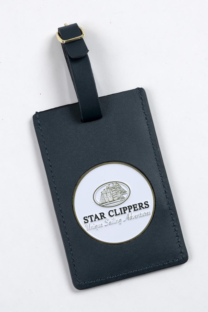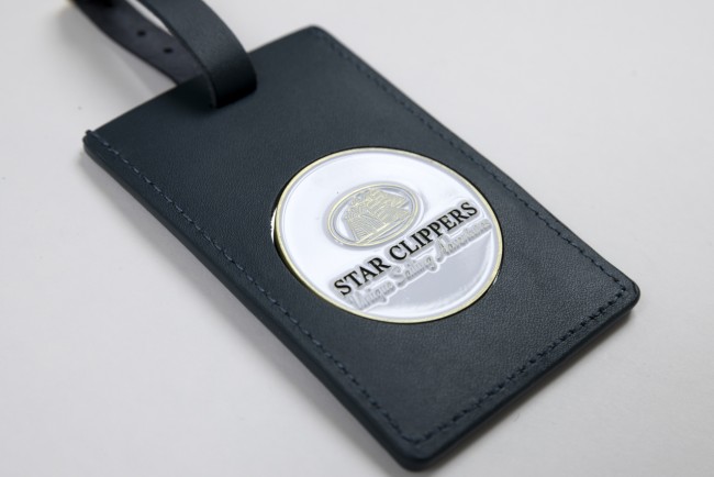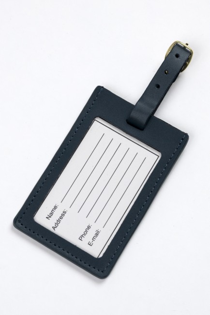 Étiquette de bagage avec anneau métallique, en cuir recyclé.