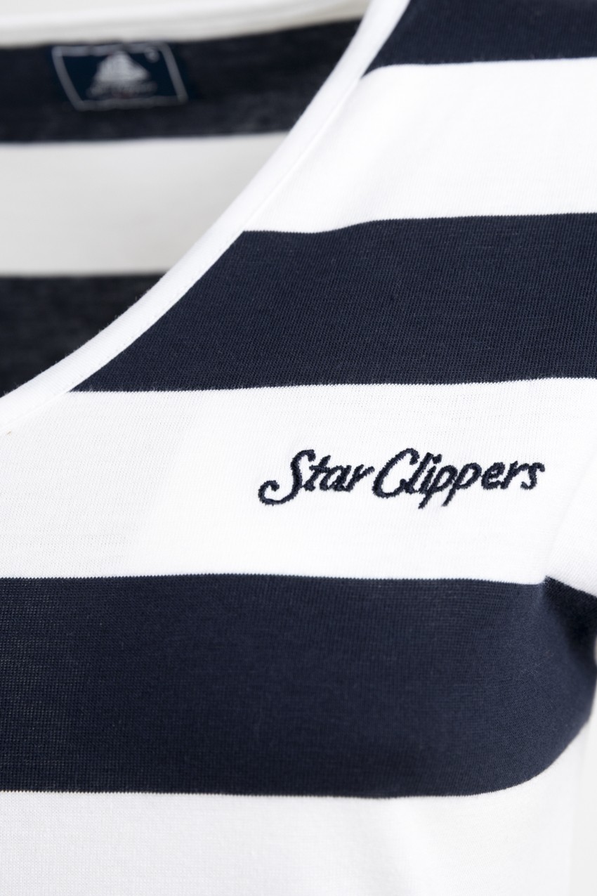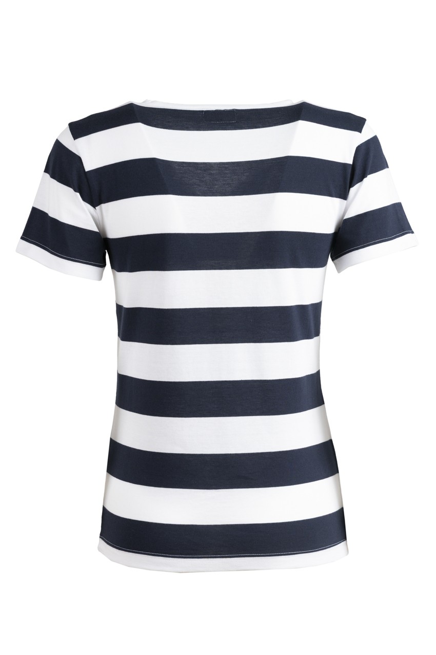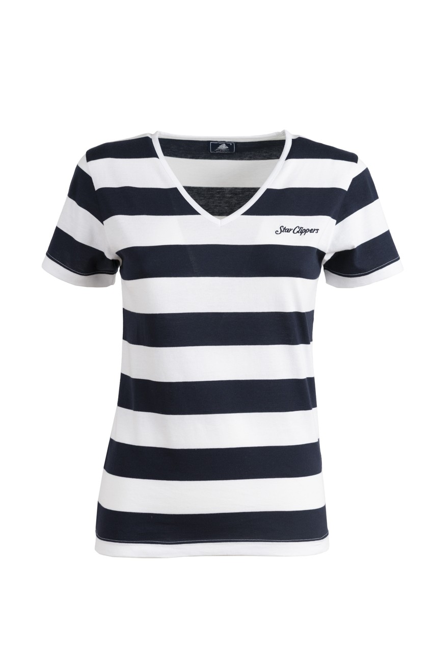 Tee shirt for Women, 100% cotton, slim fit, V collar. Elegant and feminine simplicity. Navy and white striped design. Sizes from S to 3XL.