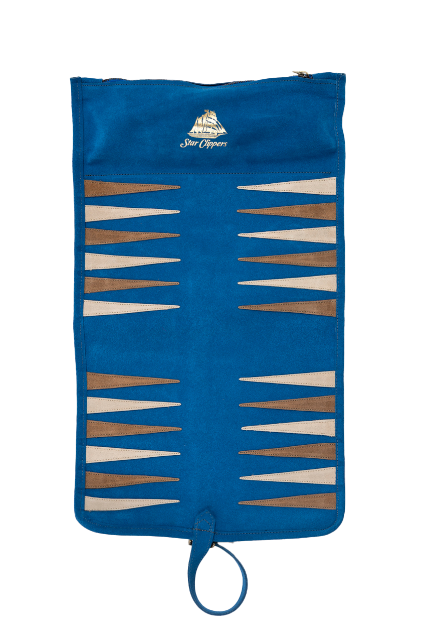 Luxury Backgammon game set in leather, travel format, featuring Star Clippers logo in gold.