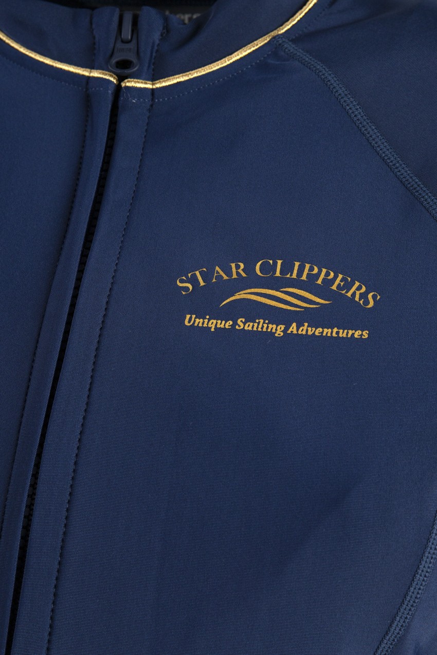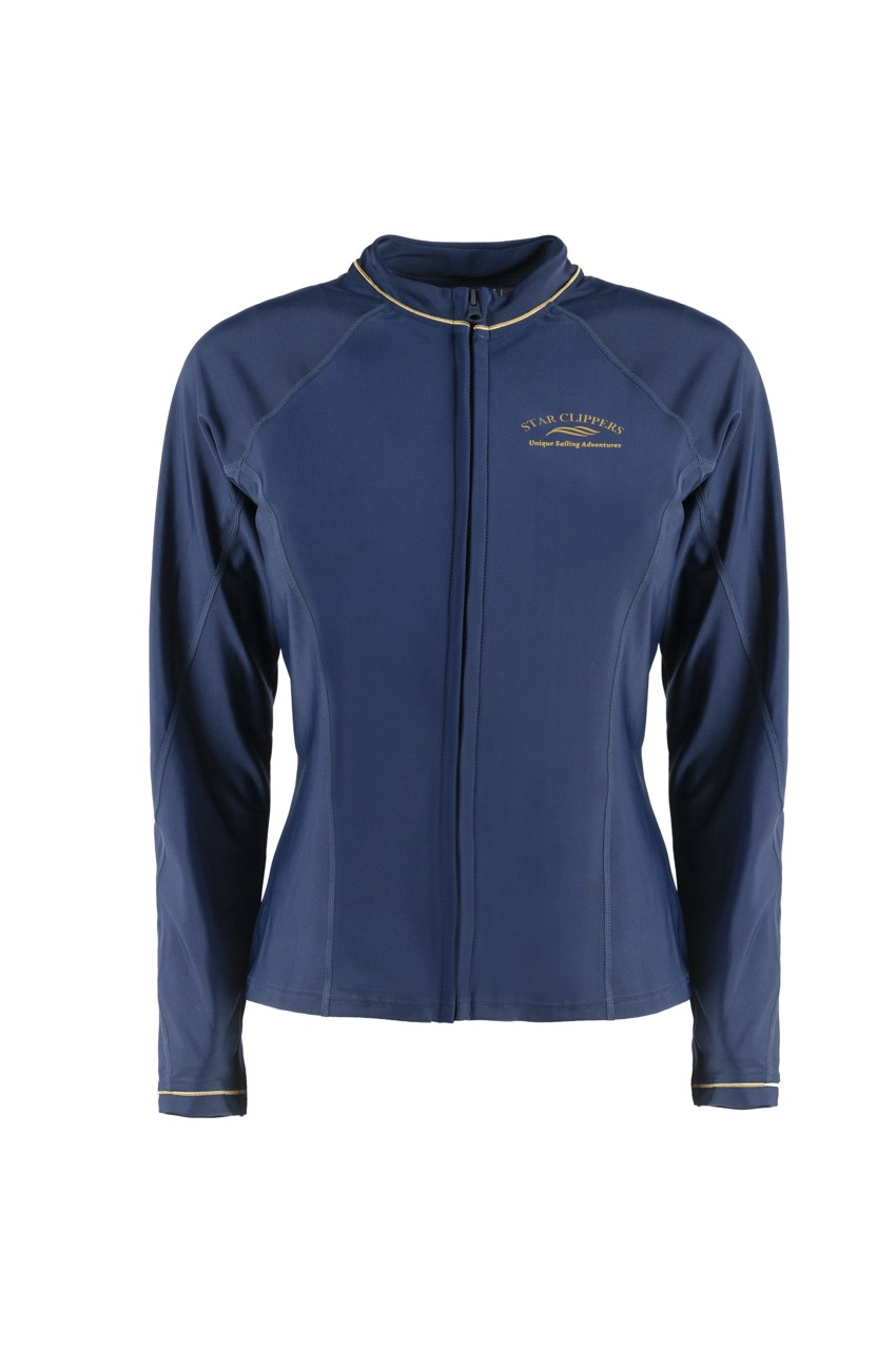 Veste de bain Moorea femme avec indice de protection SPF 50+. Coupe ajustée. Coloris : bleu marine avec logo doré Star Clippers.